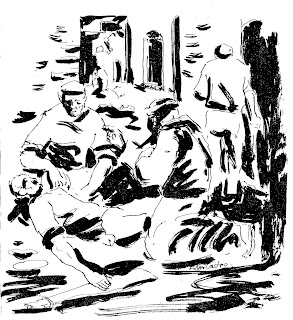 Formano un drappello spaventoso. Calano in mare una scialuppa grande e vi prendono posto, in silenzio, senza fare rumore. Sembrano diavoli fuggiti dall’inferno.